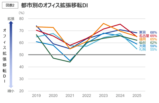 都市別のオフィス拡張移転DIは全ての都市で前年から低下したものの、55~68%に止まっている。オフィス環境に投資する企業は全国の各主要都市で増加傾向にあり、テナント側の拡張意欲は堅調に推移している。一方、東京・大阪・名古屋では募集床の品薄感が強まっていることに加え、賃料水準・移転に伴う工事費の上昇を背景に、移転計画を見直すケースが増えている。