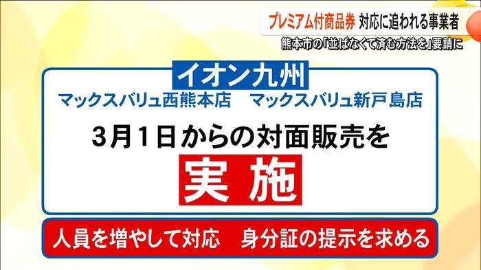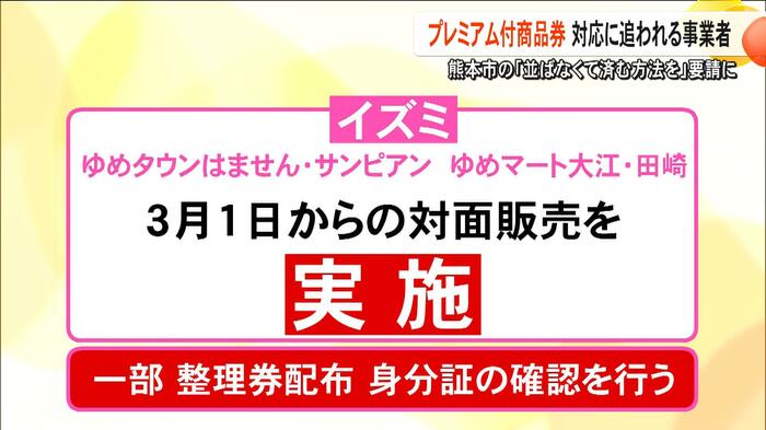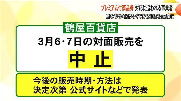 熊本市の物価高騰対策として支援しているプレミアム付商品券について、2月24日に大西一史熊本市長が「並ばなくてすむ販売方法に」などと事業者に要請したことを受けての動き。対面販売を予定していた鶴屋百貨店は、2月25日に「3月6日からの販売について中止する」と発表。他の各社も対応に追われている。