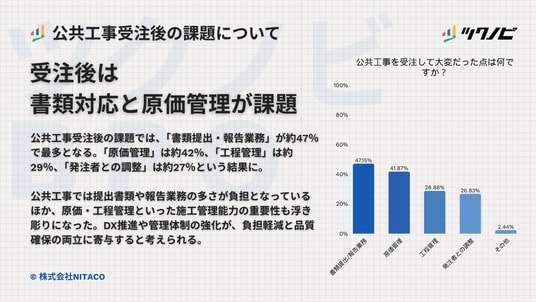 公共工事受注後の課題では、「書類提出・報告業務」が約47%で最多でした。「原価管理」は約41%、「工程管理」は約28%、「発注者との調整」は約26%でした。「その他」は約2%となっています。