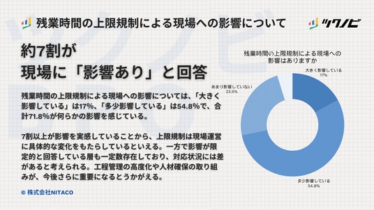 残業時間の上限規制による現場への影響については、「大きく影響している」は17%、「多少影響している」は54.8%で、合計71.8%が何らかの影響を感じています。「あまり影響していない」は23.5%、「まったく影響していない」は4.8%でした。