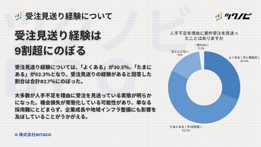 大多数が人手不足を理由に受注を見送っている実態が明らかになりました。機会損失が常態化している可能性があり、単なる採用難にとどまらず、企業成長や地域インフラ整備にも影響を及ぼしていることがうかがえます。