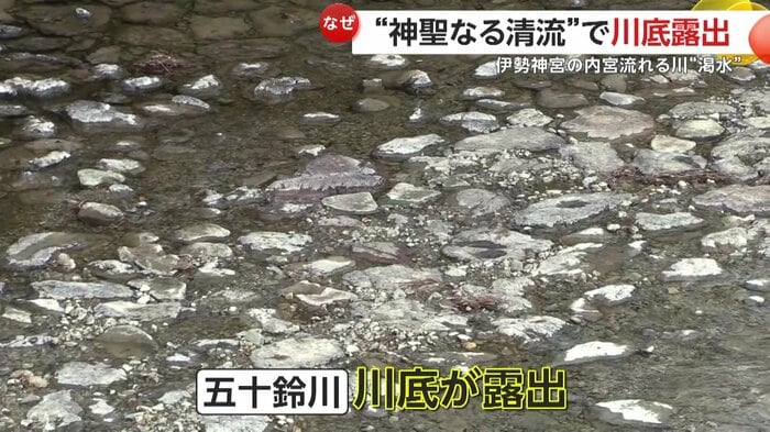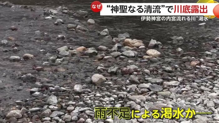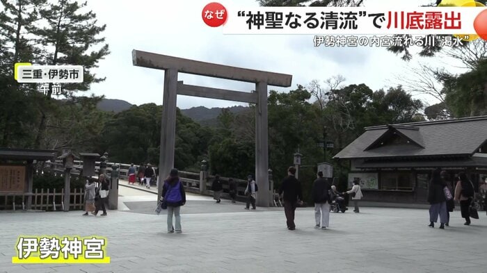 三重県の伊勢神宮のそばを流れる川五十鈴川では、水位が減り川底があらわになっている。