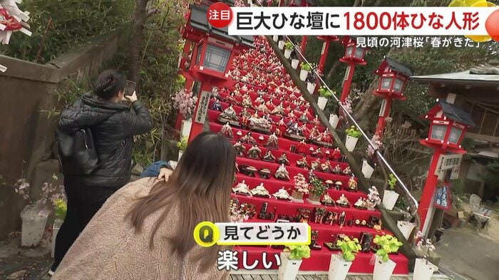 特に人気スポットになっているのが、60段の神社の石段に1800体の人形を飾った巨大ひな壇だ。多くの観光客が訪れ、ひな人形の表情や衣装を眺めたり写真撮影をして楽しんでいた。