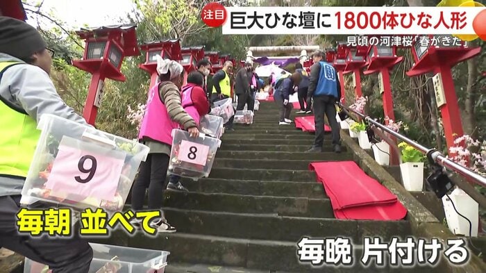 約1800体ものひな人形は、毎朝、ボランティアのスタッフなどによって屋外に並べられ、夜には片づけられる。イベントの担当者が一番気にしていたのは今後の天気だ。
