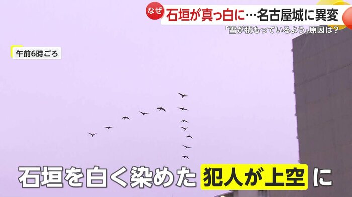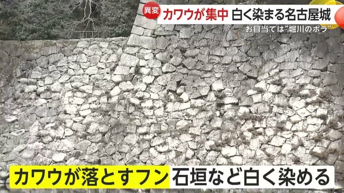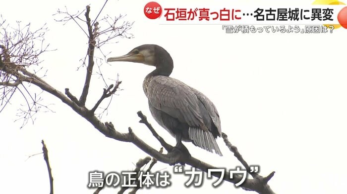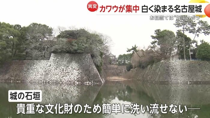 いま、愛知県にある名古屋城の石垣や木々が白く染まる異変が起きている。原因は大量に飛来したカワウのふんで、近くの川に例年より多く集まったボラを狙って集結したとみられている。石垣は文化財のため、洗浄が難しく、雨による自然清掃を待つしかないという。