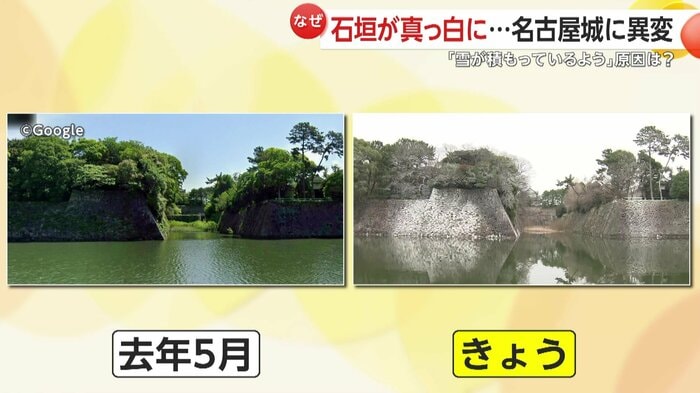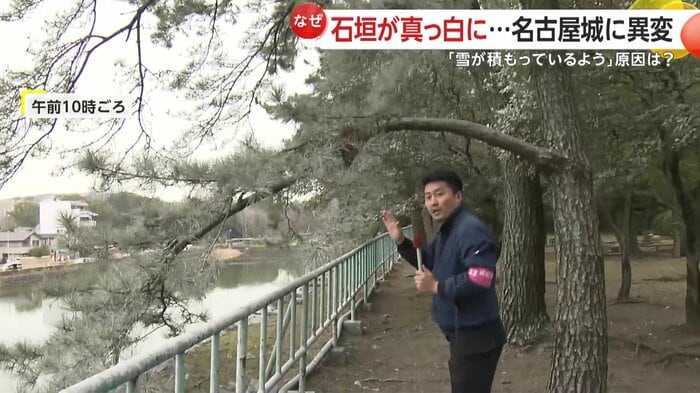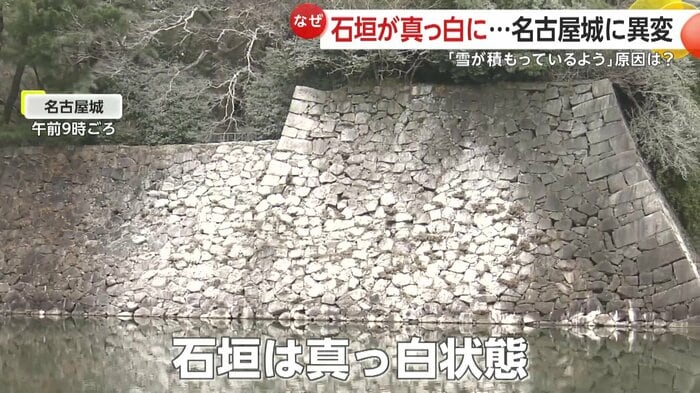 この街のシンボルである名古屋城の石垣や木々が今、まるで雪が積もったように白く染まる異変に見舞われている。FNNは早速、異変の現場へ向かった。