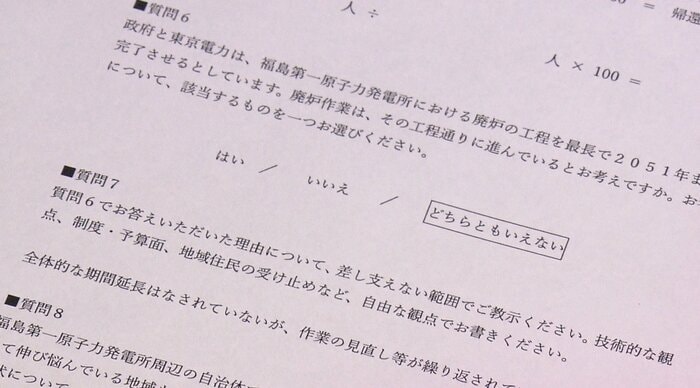 「1日も早く廃炉を完了すべき」「前例のないことに取り組んでいるので、時間がかかっても慎重に行ってほしい」「全体的な期間延長はされていないが、作業の見直し等が繰り返されている」といった声が並ぶ。