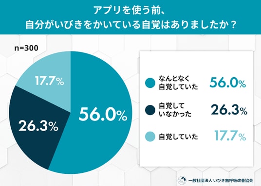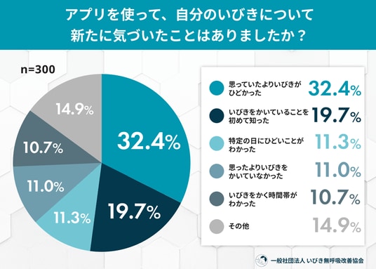 睡眠の質への関心が高まる中、スマートフォンで手軽にいびきを録音・分析できる「いびきアプリ」の利用が広がっています。自分では気づきにくい“睡眠中の音”が可視化されることで、利用者はどのような衝撃を受け、どのような行動の変化を起こしているのでしょうか。一般社団法人 いびき無呼吸改善協会は、いびきアプリを利用したことがある300名を対象に「いびきアプリ利用者の実態調査」を実施。その結果、約2割の人がアプリによって「自分がいびきをかいていることを初めて知った」と回答。さらに、3割以上が「想像以上にいびきがひどかった」と、データによる客観的な事実に驚きを感じている実態が浮き彫りになりました。