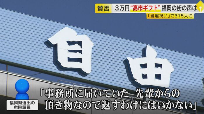 福岡選出のある自民党衆院議員は、今回のカタログギフトについて「議員同士に限らず、当選祝いの物品をもらうことはあるので違和感なく受け取った」「先輩議員にお酒をおごられたような感覚なので、わざわざ返品するようなことはしない」という反応を示した。