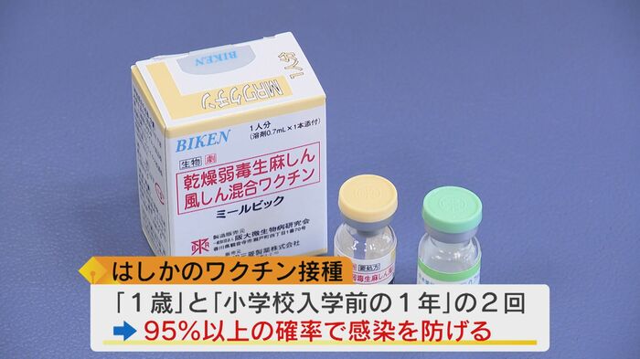はしかは『1歳』と『小学校入学前の1年』の2回のワクチン接種で95%以上の確率で感染を防ぐことができるとされている。