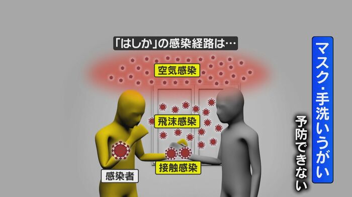 はしかは、接触感染や飛沫感染に加え、空気感染することから、マスクや手洗い、うがいでは防ぐことができず、感染者と同じ空間にいるだけでほぼ確実に感染するといわれている。