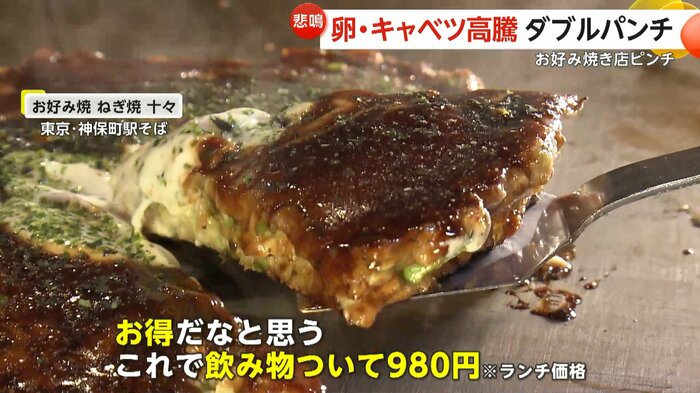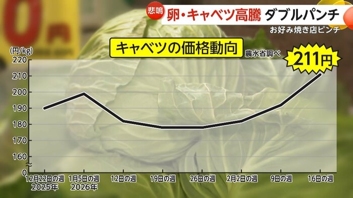 かつて「物価の優等生」と言われた卵だが、5年前の2021年1月と比べると現在は2倍以上に高騰している。さらにお好み焼きには欠かせないキャベツも、2025年末以来の雨不足の影響で値上がり傾向が続いている。