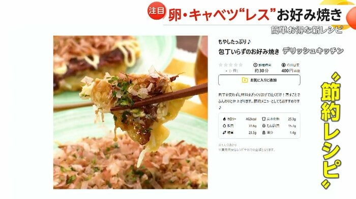 卵、そしてキャベツの高騰が続く中、レシピサイト「デリッシュキッチン」では、これら2つの食材を使わずに作るお好み焼きレシピが公開されている。