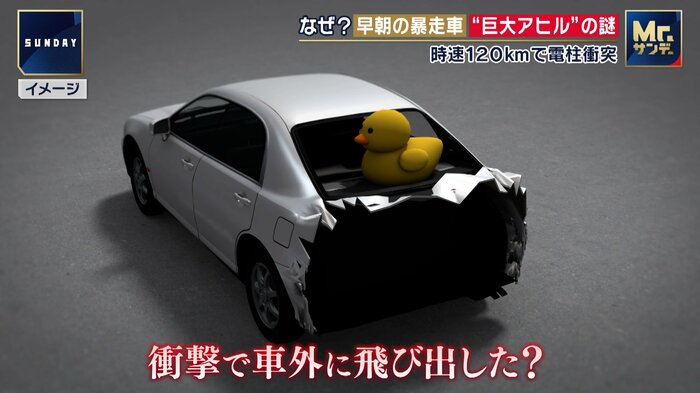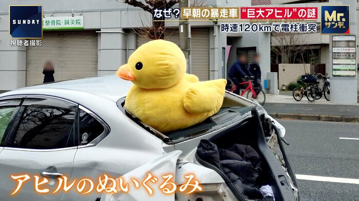 幸いけが人はいなかったが、事故現場の画像を見ると、割れたリアウィンドーの上には巨大なアヒルのぬいぐるみが・・・。いったいなぜ?