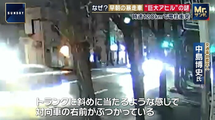 2月26日、午前5時すぎ。防犯カメラが捉えたのは、推定時速120kmで暴走する1台の車。すると次の瞬間、車は電柱に激突した反動でスリップし、車線を飛び出して対向車に衝突した。