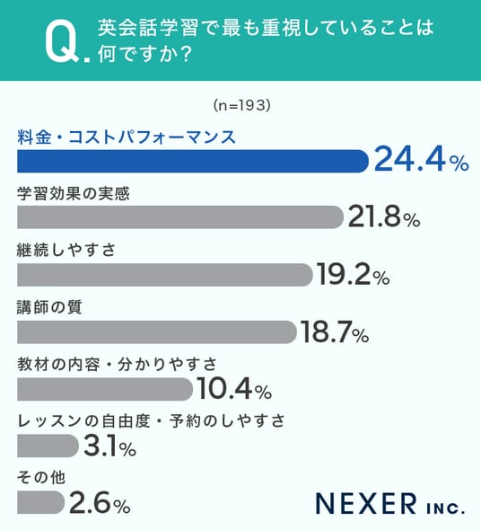 最も多かったのは「料金・コストパフォーマンス」で24.4%でした。次いで「学習効果の実感」が21.8%、「継続しやすさ」が19.2%でした。英会話学習は長く続けるケースが多いため、無理なく続けられる価格かどうかをまず重視する方が多いのかもしれません。