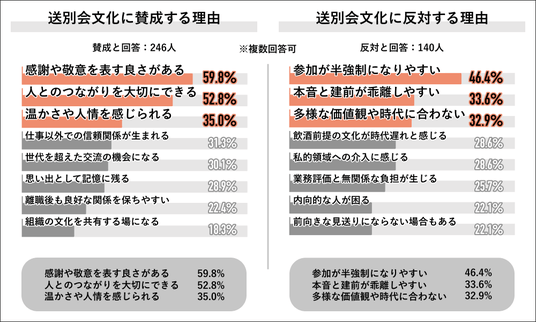 送別会文化に賛成派の246人にその理由を聞くと、「感謝や敬意を表す良さがある」が59.8%で最多となり、次いで「人とのつながりを大切にできる」が52.8%、「温かさや人情を感じられる」が35.0%となりました。送別会文化に反対派の140人にその理由を聞くと、「参加が半強制になりやすい」が46.4%で最多となり、次いで「本音と建前が乖離しやすい」が33.6%、「多様な価値観や時代に合わない」が32.9%となりました。