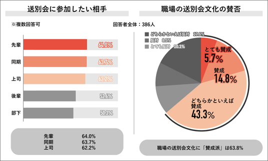 回答者全体の386人に、送別会に参加したい送別相手を聞くと、「先輩」が64.0%で最多となり、次いで「同期」が63.7%、「上司」が62.2%となりました。また、職場の送別会文化の賛否を聞くと、「賛成派」が63.8%で過半数を占め、内訳は「とても賛成」5.7%、「賛成」14.8%、「どちらかといえば賛成」43.3%でした。