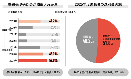 回答者全体の386人に、勤務先で送別会が開催された年度を聞くと、コロナ禍前の2018年度では41.2%だったものが、コロナ禍が本格化した2020年度には14.2%まで減少。5類移行後の2023度には45.1%まで回復し、2024年度には52.8%まで回復する傾向が見られました。また、2025年度の送別会実施有無では、「開催あり」が51.8%、「なし」が 48.2%となりました。