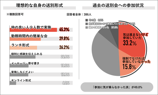 回答者全体の386人に、理想的な自身の送別形式を聞くと、「仲の良い人少人数で実施」が45.3%で最多となり、次いで「勤務時間外の簡易的な会」が29.8%、「ランチ形式」が26.2%となりました。また、過去の送別会への参加状況を聞くと、「参加に気が乗らなかった派」が49.0%となり、内訳は「気は進まないけど参加していた」が33.2%、「強制でなければ参加していなかった」が15.8%となりました。