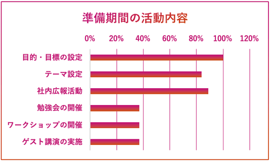- 準備期間においては目的・目標の設定やテーマ設定などを行う企業がそれぞれ100%、84%と多い。テーマの設定は中期経営計画などとの整合性を重視する企業が多い。