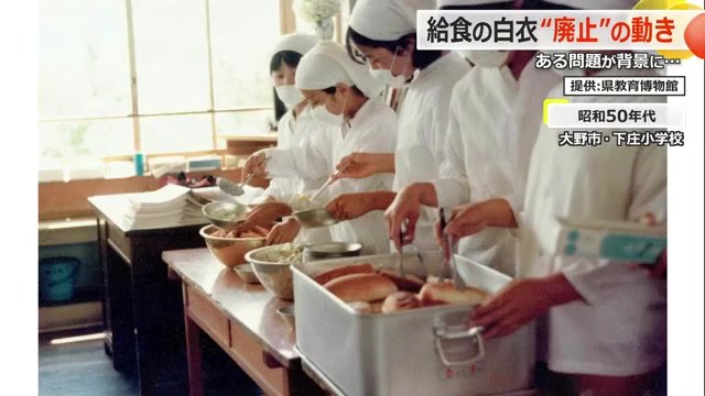 子供たちが楽しみにしている給食の時間、福井市内にある日之出小学校を訪ねると、配膳する給食当番は白衣ではなくチェック柄やキャラクターが描かれた、色とりどりのエプロンを身に着けていた。ある社会問題を背景に、いま、配膳用の白衣の供用を取りやめる動きが広がっている。