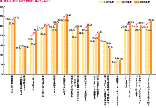 ●既婚男女に対し、「妊娠・出産に向けて現在取り組んでいること」を質問したところ、昨年からほぼ全ての項目が上昇。主に、健康的な生活習慣や、ライフプランの検討、パートナーの体に気を配ることが伸びており、妊活の取り組みは広がりを見せています。
