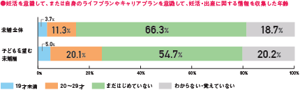●若年未婚男女の「妊活または自身のライフプラン・キャリアプランを意識して、『妊活・出産』の情報収集をし始めた年齢」について聞いたところ、全体では66.3%、子どもを望む層であっても54.7%と、半数以上が情報収集をまだ開始していませんでした。