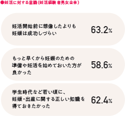 その他、約6割が「学生時代など若い頃に、妊娠・出産に関する正しい知識を得ておきたかった」(全体:62.4% 男性:61.2%、女性:63.5%)、「もっと早くから妊娠のための準備や妊活を始めておいた方が良かった」(全体:58.6% 男性:58.5%、女性:58.6%)と回答し、知識・準備不足であったことを感じています。