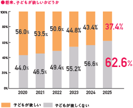 ●若年未婚男女において、「将来、子どもが欲しいかどうか」に対して、欲しい37.4%、欲しくない62.6%と回答しており、「現在、そして将来も子どもを欲しいと思わない」の回答において、2018年の調査以降、初めて女性(64.7%)の割合が男性(60.7%)の割合を上回りました。