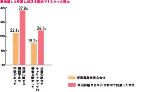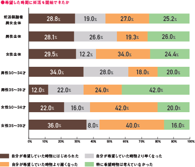 希望より遅くなったと回答。30代女性は、4割以上が希望していた時期に妊活ができなかった。