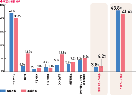 ●既婚男女の妊活の相談相手について、職場の上司・同僚への相談は、男性(3.8%)、女性(4.2%)とほとんどの方がしておらず、そもそも男女の4割以上が誰にも相談していないことが明らかになりました。