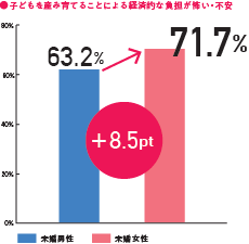 ●若年未婚男女において、「結婚・出産・子育てや生活・人生に対する意識」に対して、男性よりも女性が、子どもを産み・育てることによる「経済的な負担」と「仕事のキャリアへの支障」をより不安視しています。その差は、女性がおよそ10pt高い結果に。