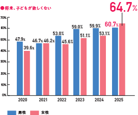 ・調査開始以降、子どもを望まないという回答が、初めて女性(64.7%)が男性(60.7%)を上回る。