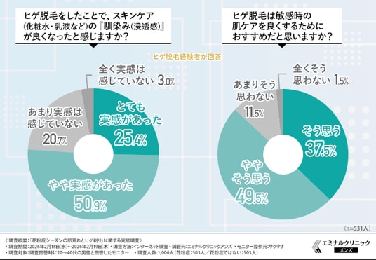 しかし、どれほど「守り」のケアを徹底しても、定期的に行うヒゲ剃りという行為が、肌荒れを慢性化させるダメージ要因となっていることがうかがえます。これに対し、合理的な解決策として示されたのが、ヒゲ脱毛という選択肢です。実際に、ヒゲ脱毛を経験した方の多くが春先の肌荒れ改善を実感し、さらに約8割がスキンケアの浸透感向上を感じています。