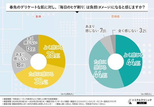「春先のデリケートな肌に対し、『毎日のヒゲ剃り』は負担(ダメージ)になると感じますか?」と質問したところ、以下のような回答結果になりました。