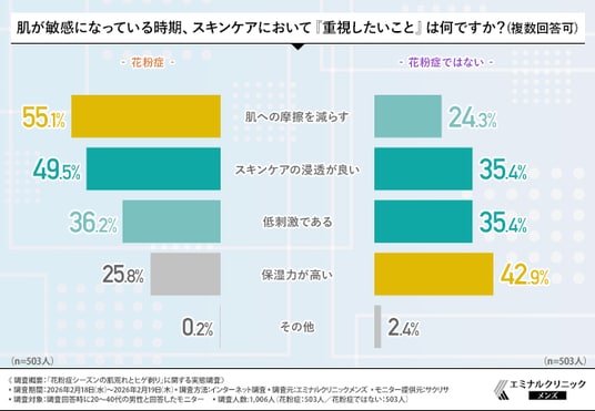 花粉症ではない方は「乾燥対策(保湿)」を最優先していますが、花粉症の方は物理的なダメージを避ける「摩擦レス」を最も重視しています。さらにどちらの層も「スキンケアの浸透」を強く求めており、バリア機能が低下しがちな季節だからこそ、効率よく成分を届けたいというニーズが読み取れます。