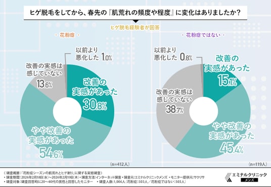 花粉症の有無に限らず、ヒゲ脱毛経験者の約9割が「春先の肌荒れ改善」を実感