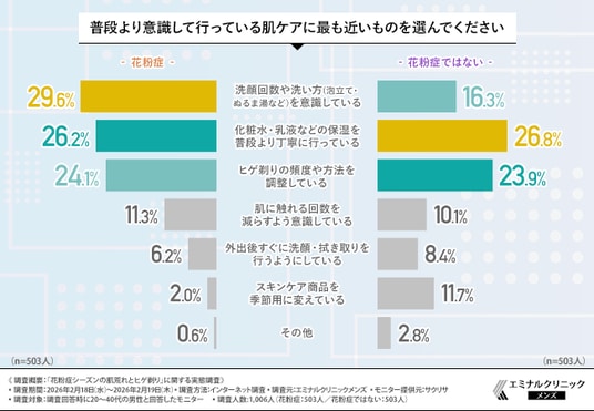 花粉症ではない方が基礎的な「保湿」を意識しているのに対し、花粉症の方では「洗顔回数や洗い方」の意識が最多になりました。肌に付着した花粉を「落とすケア」を優先しつつ、摩擦を避けるために泡立てなどを意識する傾向がみられ、花粉症ではない方では季節特有の乾燥に対し、基礎的な「与えるケア」を強化しているようです。