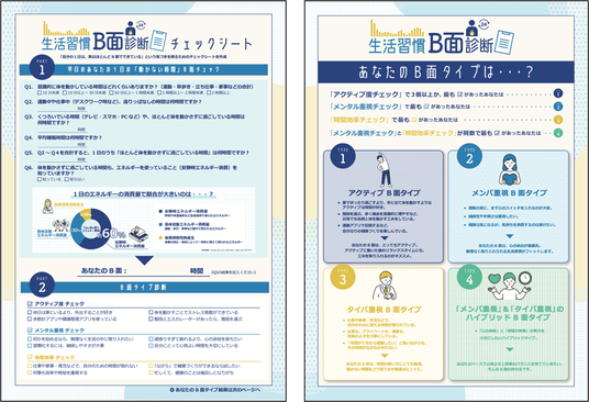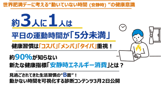運動や食事といった生活習慣は、これまで多くの健康診断やセルフチェックの中で可視化されてきました。これらをA面とした場合、座るといった動いていない時間も使われる「安静時エネルギー消費」は、見過ごされがちな領域でした。当社は、これまで注目度が低かった、動いていない時間、すなわち“生活習慣のB面”に目を向ける試みとして、「生活習慣B面診断」チェックシートを公開します。「生活習慣B面診断」は、簡単なチェックシートへの回答を通じて、日常的な生活行動から動いていない時間を可視化し、自身の生活”B面”の傾向をタイプ診断するツールです。