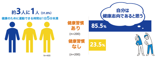 さらに、「健康志向である」と回答した割合は、運動習慣がある人では85.5%に達した一方、運動習慣がない人では23.5%にとどまりました。