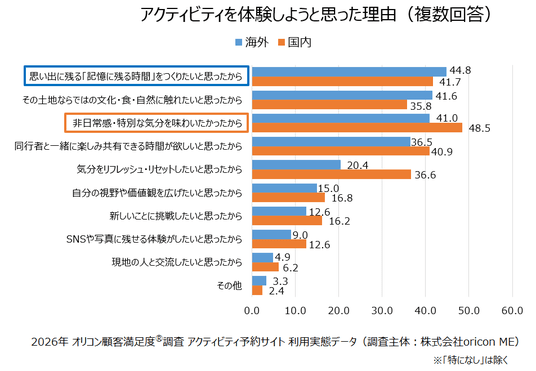 『アクティビティを体験しようと思った理由(複数回答)』について聴取したところ、海外での利用者からは「思い出に残る「記憶に残る時間」を作りたいと思ったから」が44.8%と最多となったのに対し、国内での利用者からは「非日常感・特別な気分を味わいたかったから」が48.5%で最多となりました。