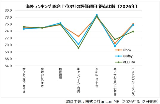 『アクティビティ予約サイト 海外』総合上位3社の評価項目得点比較(オリコン顧客満足度調査)