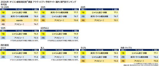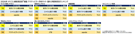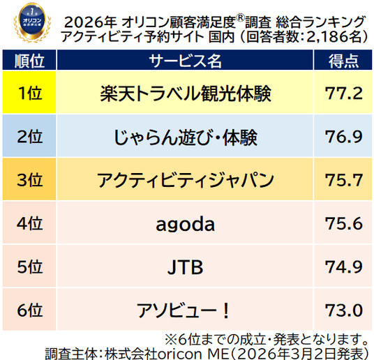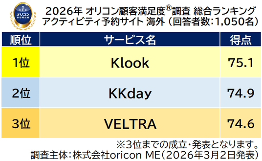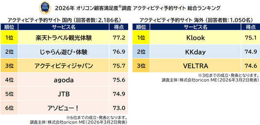 オリコン株式会社(本社:東京都港区 代表取締役社長:小池 恒、略称:オリコン)は、グループ会社である株式会社oricon MEが、実際のサービス利用者を対象に第三者の立場で実施した『アクティビティ予約サイト(国内/海外)』の顧客満足度調査の結果を、2026年3月2日(月)14時に「オリコン顧客満足度(R)」公式サイト内にて発表いたしました。ランキングの結果は、下記の通りとなりました。