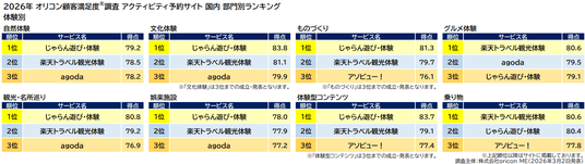 『アクティビティ予約サイト 国内』体験別ランキング(オリコン顧客満足度調査)