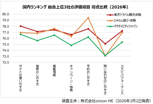 『アクティビティ予約サイト 国内』総合上位3社の評価項目得点比較(オリコン顧客満足度調査)