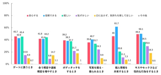 一方で、「断ったことで困ったことや良かったことがあったか」という問いに対して最も多かった回答は「特に困ったことも良かったこともない」(25.5%)となりました。また、「話し合いながら関係を進めることができた」「不安を解消できた」「信頼関係が深まった」といったポジティブな回答も、それぞれ10%程度見られました。さらに、シチュエーション別に「同意を取られること」についての感情についてたずねた設問では、ほぼすべてのシチュエーションにおいて「安心する」「信頼できる」「嬉しい」が4割以上を占めています。「同意」は安心と信頼を育むコミュニケーションであることが示されています。