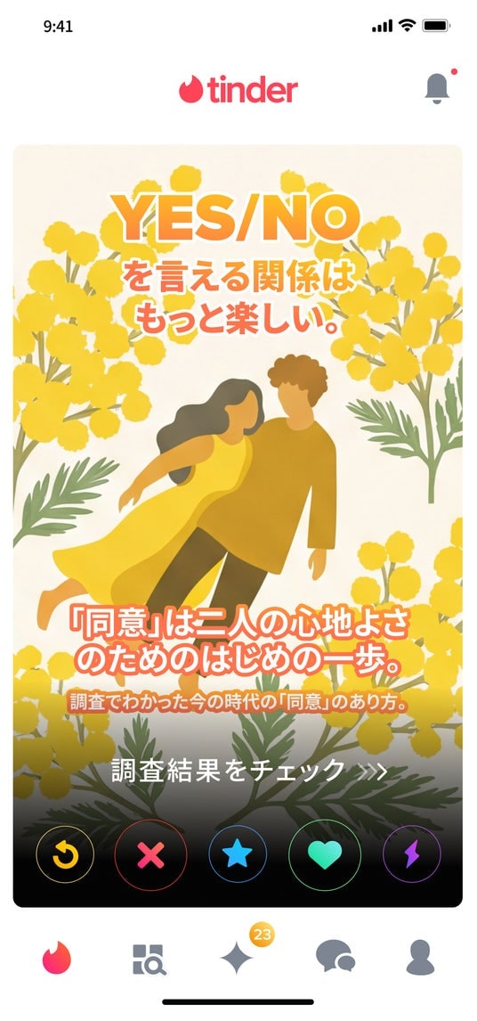 今回の調査結果を受けて、3月4日(水)から国際女性デー当日の3月8日(日)までの間、Tinderアプリ内でも啓発を行います。スワイプ画面内に調査結果を知らせるカードを配信し、「性的同意」に関する理解を深めていただける機会を提供します。