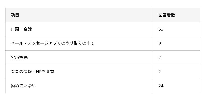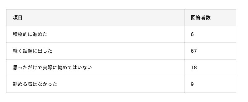 - エアコンクリーニングを他人に勧めたいと思った人の内、大多数が「軽く話題に出した」ことで勧めた。