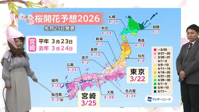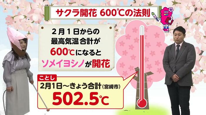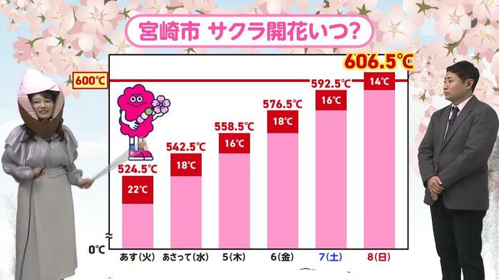 古山予報士によると「さすがにそんなに早くは咲かない」とのことでした。ウェザーニュースの最新予想(2月25日発表)では、宮崎市の開花予想は3月25日とされています。実はこの法則、地域によって差があるそうで、宮崎の場合は800℃くらいが目安になるのではないか、と古山予報士は分析しています。